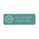 Modern monogram return address labels with easy to personalise templates - A white wreath silhouette surrounding a simple monogram on a teal green background. The template for your name is in a chic calligraphy script and the address is written in a simple font. Personalised return address labels with a feminine wreath and monogram adds a clean and personal touch to your mail. To change the background colour, font styles and sizes click the personalise button.