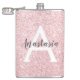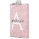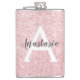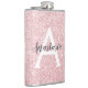 Chic and glam blush pink rose gold glitter sparkles metallic flask, with a large, white monogram initial and your custom name in an elegant grey script font. Personalise this trendy flask with your name or monogram initial. You can change the text colour and font style and size using the customise option.