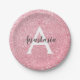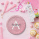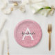 Chic and glam blush pink rose gold glitter sparkles metallic paper plate, with a large, white monogram initial and your custom name in an elegant grey script font. Personalise this trendy paper plate with your name or monogram initial. You can change the text colour and font style and size using the customise option.
