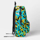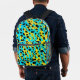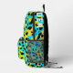 This cool, youthful backpack features a colourful trendy design with orange, black, turquoise leopard spots pattern allover, and a white customisable name on the top with a large bold script.