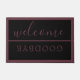 Chic, modern black and burgundy doormat with the text welcome and goodbye in burgundy elegant hand lettered script calligraphy and stylish typography on a black background. Perfect luxury design gift for a new home, new homeowners or newlyweds. Exclusively designed for you by Happy Dolphin Studio. If you need any help or matching products please contact us at happydolphinstudio@outlook.com.