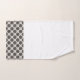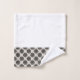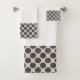 Deep, rich mocha brown symmetrical coin shapes create an elegant, modern repeat pattern on a taupe grey background. The eye of a bicycle wheel inspired this pattern. Digital brushes create a soft subtle textured look within the circular shapes making this a chic look on this towel set. White towel set with the design accent on one side. Look for a similar design on shower curtains in the bath decor collection to create a cohesive look in your bathroom.