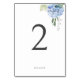 Chic and elegant floral wedding table number featuring a table number and optional couple names along with a beautiful blue hydrangea design, both back and front. Text comes in dark grey against a white background. Personalise this card to make it your own.