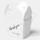 Elegant white on white filigree print pattern with your names and thank you in chic lettering on the front, these takeout style party favour boxes are beautiful for wedding favours, bridal shower favours or any special occasion.