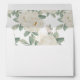 A watercolor bouquet of white and ivory roses with delicate leaves is displayed over the return address and a pattern of white flowers decorates the inside of this elegant white envelopes adding a chic botanical twits.