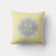A chic yellow art deco arched scallop pattern square throw pillow with a soft grey quatrefoil badge you can personalise by easily adding your own monogram and name. This is part of the Meadowlark Scallops Harbour Mist Monogram Spring Collection.