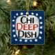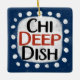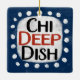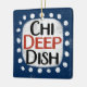 A fun and cute typographic message design that says "Chi Deep Dish". It has black and red text on a white rectangle with funky, playful white dots surrounding it, all on a blue background.