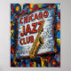 High quality poster of a colourful, acrylic art design featuring downtown marquee of a Chicago Jazz Club complete with saxophone, musical notes, and abstract background in yellow, blue, and red.