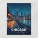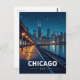 Stunning retro travel poster style art capturing the iconic Chicago, USA skyline at night from a train platform. Perfect for Chicago lovers, travelers, city dwellers, and fans of beautiful urban nightscapes.