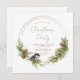 Nature-inspired design with a watercolor chickadee bird resting among pine branches, cones, and scattered gold dots. The arched layout and handwritten script create a calm, festive look with soft green and copper tones. Ideal for winter-themed products and seasonal gifts.