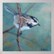 A pert little Mountain Chickadee perches on a branch, ready to take flight. This image is from an original oil painting by award winning Colorado artist Debra Mickelson.