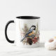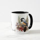 This is a pretty mug for anyone, with the image of a pert little chickadee perched on a pine branch with a pine cone and red berries. Behind the bird images is a trail of a gold swirl. The image is repeated twice on the mug, with your name in black between them. A pretty scene for any season!