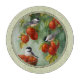 Birds in the apple orchard during the autumn harvest. Two black-capped chickadees perch in an apple tree while a third chickadee sits on a basket filled with ripe, freshly harvested fruit ready for market. All on a cheerful green patterned background. Realistic artwork created from an original oil painting by wildlife artist Crista S. Forest.
