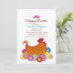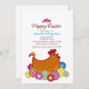 A festive invitation to Easter Brunch and Egg Hunt. The card features a hen with decorated eggs and whimsical flowers. The header has three little hearts and the words "Happy Easter".