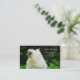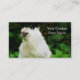 Colour photograph of a young white chicken surrounded by lush green vegetation. The perfect choice for the farmer that sells hatching eggs, chicks, or pullets for meat or eggs. Both sides are customizeable with your own text. Another version is available with the hen facing the text fields here