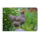This chicken's name is Janet and she is posing on top of a carved wooden mushroom.