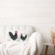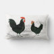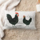 Pillow with vintage image of a black hen and a rooster. Back side of pillow is a black and white check.