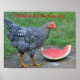 This poster features a barred rock hen who loves watermelon! Chickens have become the latest sought after pet due to their practical nature and that they are fairly easy to care for.