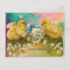 CHICKENS, SNOWDROPS AND EASTER EGG WITH BLUE BOW HOLIDAY POSTCARD