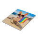 This cute photo features a chihuahua dog at the beach carrying a rainbow colored Gay Pride flag.