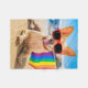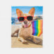 This cute photo features a chihuahua dog at the beach carrying a rainbow colored Gay Pride flag.