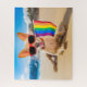 This cute photo features a chihuahua dog at the beach carrying a rainbow colored Gay Pride flag.