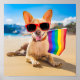 This cute photo features a chihuahua dog at the beach carrying a rainbow coloured Gay Pride flag.