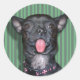 A cute Black Apple Head Chihuahua photograph image with his tongue sticking out with a green aqua emerald striped background.