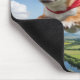 A mousepad featuring a superhero Chihuahua wearing a red cape flying over a pretty scene.