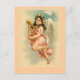 Beautiful vintage image of a dark-haired child angel dressed in pink with a yellow floral wreath on her head and carrying her harp.