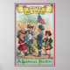 A group of children are preparing to march in their very own Fourth of July parade. They are carrying umbrellas and brooms in lieu of rifles. One girl is playing a drum, a boy holds up the American flag and another boy dressed in a military outfit holds a sword in this vintage patriotic postcard from 1909.