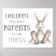Poster with an adorable watercolor painted bunny and the bible verse, "Children obey your parents in all things" taken from Colossians 3:20. Designed by Simply Scripture by Robin.