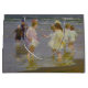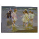 This design features a painting by the American Impressionist painter Edward Henry Potthast (1857–1927). It depicts a group of children wading in water as the waves lap against their feet on a beach located on the east coast of the United States of America. The scene may be Brighton Beach in New York City, where Potthast often came to paint. The boys are wearing shorts and the girls are lifting up their dresses, so that their clothes don't get wet. The girls are wearing bows in their hair. There is also a woman with her son in the background. Everyone is having fun at the beach in this vintage scene of American life. The original artwork was painted by E.H. Potthast in 1920.