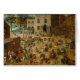 Children's Games by Pieter Bruegel the Elder, 1560, is an oil and tempera painting of a panoramic landscape of a town square. Countless figures of children run and play in the streets in a veritable catalogue of every type of children’s game: dolls, ball, tiddlywinks, hoops, handstands, and the rest. After a time the viewer may notice that the entire city is taken over by children at play, a possible witty comment or allegory by Bruegel on the world of adults.
