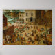Children's Games by Pieter Bruegel the Elder, 1560, is an oil and tempera painting of a panoramic landscape of a town square. Countless figures of children run and play in the streets in a veritable catalogue of every type of children’s game: dolls, ball, tiddlywinks, hoops, handstands, and the rest. After a time the viewer may notice that the entire city is taken over by children at play, a possible witty comment or allegory by Bruegel on the world of adults.