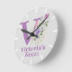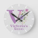 Design features Monogram & Name with Flowers either side in a water colour pastel style. Example name is Victoria. Childs Bedroom Clock. Change name as desired for anyone with a name beginning with V.