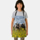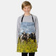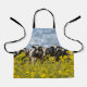 If your little one loves making messes and adores cows, then they will love this handy apron with a row of black and white cows standing behind a barbed wire fence with bright yellow weeds in the foreground and a turbulent blue-grey sky above.