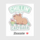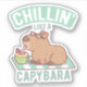 A cute doodle of a capybara with sunglasses relaxing on a beach towel drinking a fresh coconut drink. The funny caption reads "Chillin Like A Capybara".