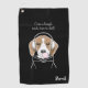 The design features an illustration of a relaxing beagle wearing headphones and blowing pink bubblegum. With your personalised text and favourite background colour, it makes a cute, funny, and unique golf towel for dog lovers.