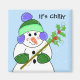 A snowman all bundled up in a toque, earmuffs and mittens, holding a branch of holly berries.