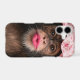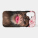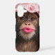 A charming chimpanzee wearing a floral pink hat, playfully holding its brim, while its exaggeratedly bright pink lips add a whimsical and humorous touch