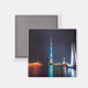 China Shanghai Oriental Pearl Tower Futuristic Television and Communications tower on bank of Huangpu River. Illuminated nighttime view of tower and city lights.