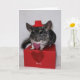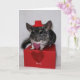 Standard grey chinchilla with red top hat, pink heart, sitting on valentines box