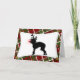 Fun Chinese Crested Christmas Card has a hairless dog breed silhouette, with reindeer antlers and a bright red glowing nose. The background is a cheery holiday plaid with reds and greens. The inside reads, "Wishing you and your family a wonderful holiday season!" Personalise the message to your own easily. Cute dog lover Christmas cards.
