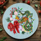 A Chinese dragon playing with Christmas lights on a Christmas wreath with Christmas balls, red bow, ornament, Christmas lights, evergreen tree in a backdrop of blue