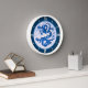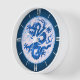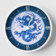 Clock in a Chinese dragon pattern adapted from antique porcelain china, in deep indigo blue and white on a soft swirled background of clouds