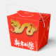 Large wishes "Happy New Year" in Chinese (white modern calligraphy) and in English, Dragon golden paper-cut (image printed - model n°1). Design on Take-out favour box with red background + Family name and message to customise. You can easily change text (font, colour, size and position) and background colour by clicking the customise button. Available in other style: gable, tent and cube boxes and with other Dragon paper-cuts. Perfect for Chinese New Year of The Dragon 2024.