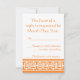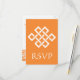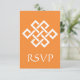 This elegant RSVP card features a bright orange background and a large Chinese good luck knot in white on the front. An orange border along the bottom edge of the card with a white geometric pattern inspired by Chinese ornamentation decorates the back with some sample text in place above that can be customised to fit your needs.