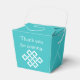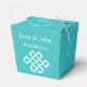 Give your guests, bridesmaids, groomsmen, or anyone else a special treat with these customisable favour boxes featuring a bright turquoise background with a white Chinese good luck knot on the front and back of the box. Both of these sides also feature some sample text that you can customise for your own wedding or event.