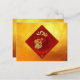 Simple golden Rabbit paper-cut into a decorated circle with Chinese lantern and golden Fu ideogram (meaning Luck), blossoms and Chinese greeting into small circles under the Rabbit + "Year of the Rabbit" in hand writing style + small old Chinese ideogram for Rabbit onto a golden textured paper (image printed). Design on horizontal holiday postcard for Chinese New Year of the Rabbit 2023. Matching greeting card, square flat card, square sticker, party supplies and more soon... Perfect for Chinese New Year of the Rabbit 2023.